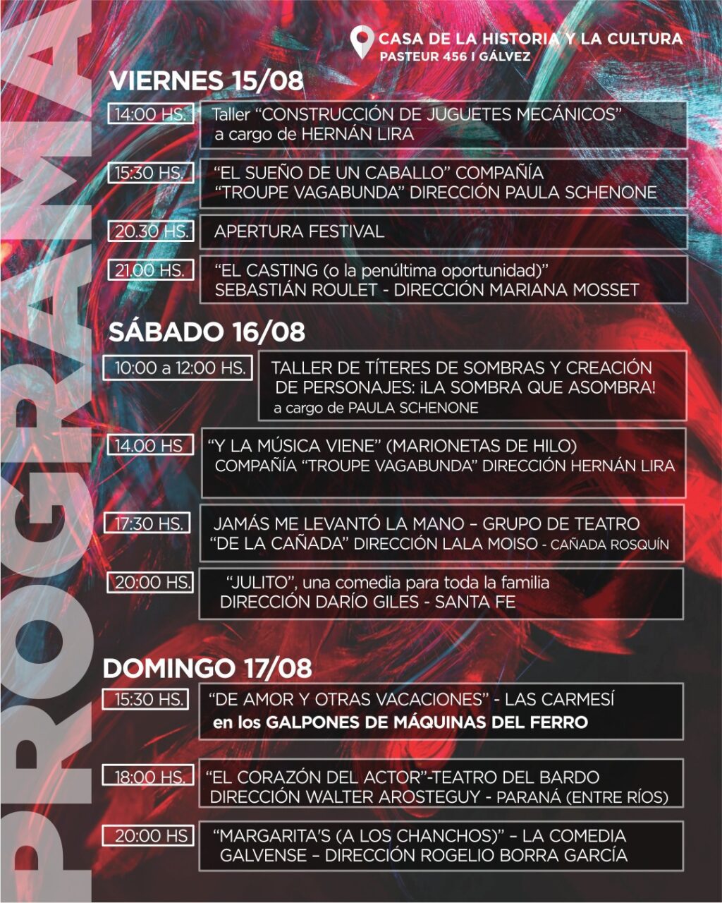 Serán tres días de espectáculos, talleres y encuentros con artistas de la región, para disfrutar en familia, con entrada libre y espectáculos a la gorra en la Casa de la Historia y la Cultura del Bicentenario (Bv. Pasteur 456). A continuación el cronograma completo.
