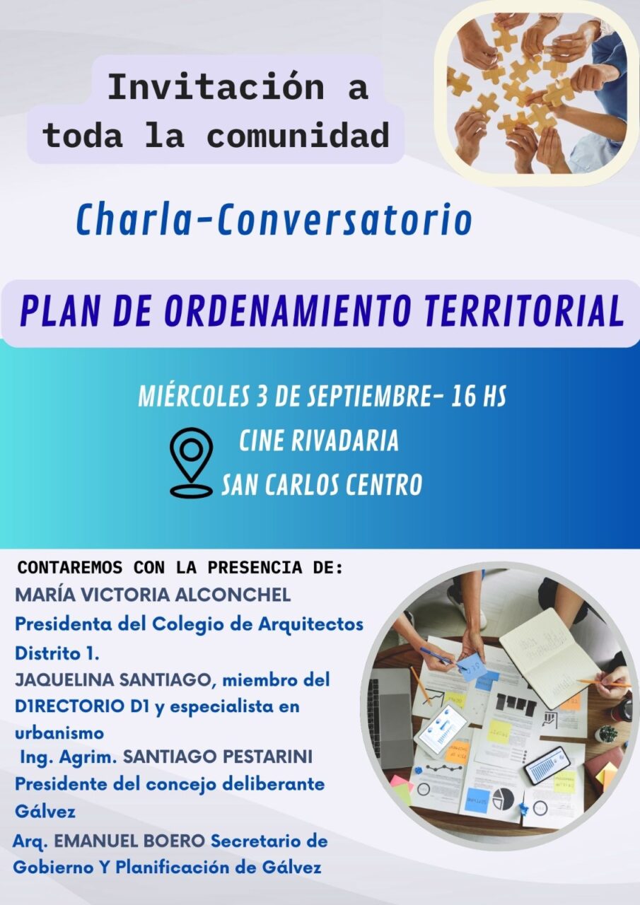 Durante la reunión, los concejales sancarlinos invitaron al equipo de Gálvez, encabezado por Emanuel Boero, a participar de una Charla-Conversatorio sobre el Plan de Ordenamiento Territorial, que se realizará el miércoles 3 de septiembre, a las 16 hs, en el Cine Rivadavia de San Carlos Centro, con la presencia de representantes del Colegio de Arquitectos y especialistas en urbanismo, donde el equipo galvense expondrá su trabajo a vecinos de localidades de toda la región.