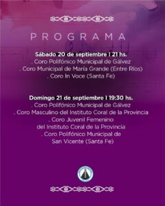 ¿Qué se viene para este año? ¿Quiénes van a estar? El sábado el Coro Polifónico Municipal de Gálvez, un coro de la provincia de Entre Ríos, más precisamente de María Grande, y el Coro «In Voce» de la ciudad de Santa Fe. El domingo, nuevamente nuestro coro municipal coro municipal, el coro polifónico municipal de San Vicente, el coro masculino del Instituto Coral de la Provincia de Santa Fe, que funciona en Santa Fe capital, y el Coro Juvenil Femenino, también del Instituto Coral de la Provincia, por lo tanto, una variedad de formaciones.
