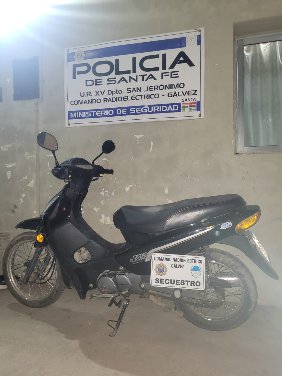 Este domingo por la noche, mientras personal del Comando Radioeléctrico de Gálvez realizaba patrullaje prventivo, visualizaron en la interseción de calles San Martín y Rivadavia a un masculino el cual circulaba en una motocicleta marca Keller, modelo Crono, por calle San Martín en sentido contrario al permitido, por lo que procedió a detenerlo y consultar por sus datos filiatorios y datos de la moto.