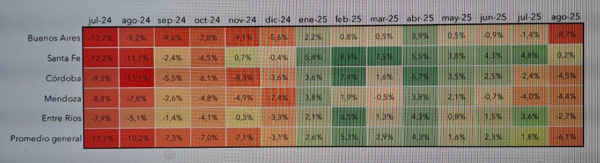 A su vez, Buenos Aires (-8,7%) se consolidó como la provincia de peor desempeño relativo,
