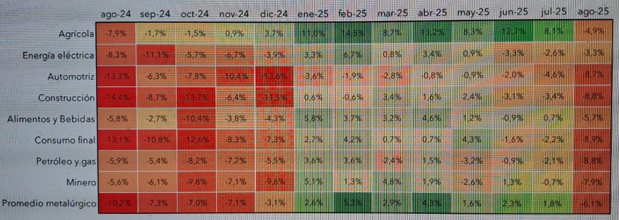 En contraste, las empresas de energía eléctrica (-3,3%), minería (-7,9%) y petróleo y gas (-8,8%) continuaron en terreno negativo, afectadas por la menor inversión y la baja dinámica en las cadenas extractivas y energéticas.